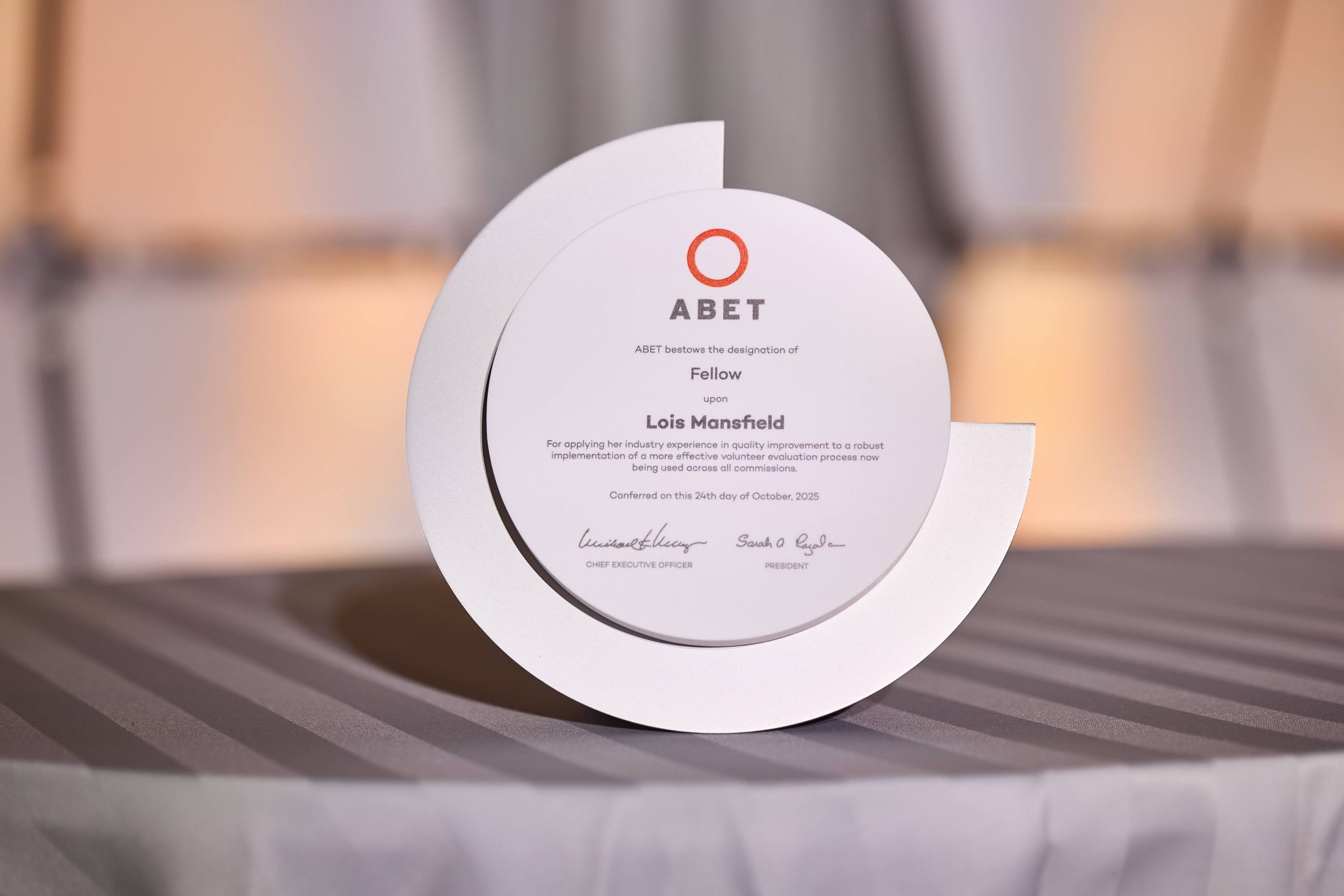 “I started as a program evaluator in 1999, and I am grateful for the opportunities. It has been an amazing and humbling experience, and I am truly honored to receive the award of ABET Fellow,” says Mansfield (read by proxy due to absence).